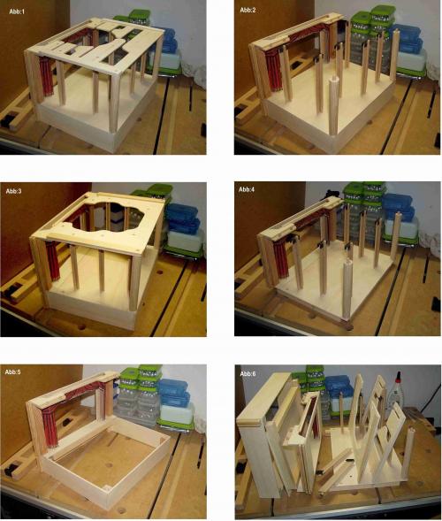 Zwei kleine Leisten bilden einen Anschlag, damit die Platte nach unten fixiert ist. Die Führungsleisten links und rechts an der Bühne sind auf Abb:4 zu sehen.