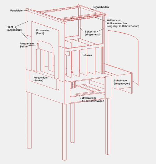 3. Alle Teile aus dem Fach unter dem Zwischenboden, also Seitenteile, Schnürboden, Panorama-Hintergrund und Proszenium-Front werden entnommen.