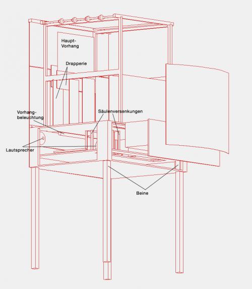 (Die Kulissenwägen und die zugehörigen Schienen, Schlitze und Seile sind hier nicht dargestellt, sind aber fest in der Unterbühne montiert.)